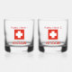 Personalised rocks or whiskey glasses show the Swiss Flag with the word SWITZERLAND underneath in snow-capped letters. The flag of Switzerland is a white square with a red cross in the centre. Above the flag is a place for your name in red letters, so you can personalise your look or create a special gift. Great housewarming gift for the home bar. Fun to use at friend or family reunions and club or travel group events.