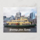 Greetings from Sydney postcard featuring the famous green and gold Sydney Ferry at King Street Wharf near Darling Harbour, Sydney, Australia - customisable postcard.