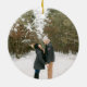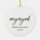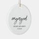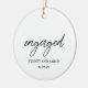 Modern Christmas ornament featuring a contemporary typographic design with "engaged" in elegant script typography along with your names and engagement date in a simple and minimal layout. The back has your favourite photo. The colour theme is black and white and may be changed the design editing tool. This minimalist style ornament is great for a couple for their first Christmas engaged.