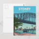 Retro Sydney Australia travel poster illustration that features a view of the Sydney Harbour Bridge in the foreground with the Sydney skyline in the background. This vintage design will bring back memories of classic travel posters from a bygone era.