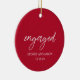 Modern Christmas ornament featuring a contemporary typographic design with "engaged" in elegant script typography along with your names and engagement date in a simple and minimal layout. The back has your favourite photo. The colour theme is red and may be changed the design editing tool. This minimalist style ornament is great for a couple for their first Christmas engaged.