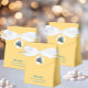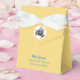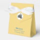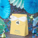 Celebrate in Sicilian style with this yellow tent favor box tied with a white satin ribbon. The front flap features a porcelain-inspired Trinacria accented with soft yellow lemons inside a white circle. “Mille Grazie” appears in elegant blue script (customizable), with space below for names, dates, or any wording. The back showcases a larger Trinacria inside a white circle. Text can be removed if preferred—perfect for weddings, showers, or special events.