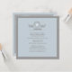 An elegant and sophisticated invitation in a soft blue with a grey border. The card features a decorative header with a circular window with a dove. It is flanked by abstract foliage. (FP)