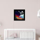 This highly colourful artwork contains two nature spirits - the Earth child, with her hair of flowers and plants, and gown of bright soil, flowing in rainbows into the bright blue ocean. Riding the white spray of the cresting wave, is a silver winged spirit of the sea and the sky, a seagull gliding past her. Behind the streaming silver of her hair and wings, the full moon shines.