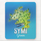Symi Island Greece travel poster with a beautiful blue propeller aircraft flying past.
