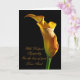 A stately golden arum lily stands lit from the side . A perfect flower to convey words of sympathy.