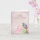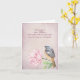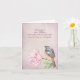 Watercolor robin on soft pink peony flower on textured pink background thank you from family.