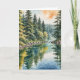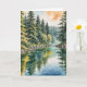 A tranquil forest scene features a river mirroring tall pine trees beneath a sky adorned with orange clouds in a watercolor style.