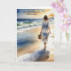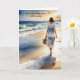 Watercolor artwork depicts a woman in a white dress walking barefoot along a sunlit beach while carrying a basket of flowers, as waves gently lap at the shore.