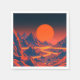 A synthwave-inspired landscape artwork rendered in warm orange and indigo hues. The scene features sleek geometric shapes highlighted by vibrant yellow retro neon lights, set against a surreal mountainous background with distinct grid patterns. This piece embodies the aesthetic of 1980s synthwave culture through its unique colour palette and futuristic yet nostalgic design.
