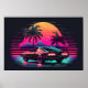 "Synthwave Summit: Racing to the Sunset" is a visually stunning piece of art that captures the excitement and energy of a high-speed race through a mountain range. The artwork depicts a sleek, futuristic car as it speeds towards the horizon, its curves and chrome gleaming in the warm light of the setting sun. The car is surrounded by a stunning mountain landscape, with jagged peaks and rolling hills stretching off into the distance. The colours of the sunset are reflected in the car and the landscape, creating a surreal and otherworldly atmosphere. This artwork is the perfect blend of synthwave aesthetics, futuristic sci-fi, and breathtaking natural beauty, making it a must-see for anyone who loves unique and engaging art.