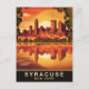 Syracuse postcard. City waterfront, Sunset over Syracuse skyline, New York State. Illustrated travel postcard in vibrant colours