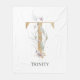 Letter T monogram floral. Letter T in golden brown texture accented with green watercolor compound leaves, flower blossoms and gold dust. Personalised with name in matching font.