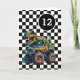 A dinosaur monster truck 12th birthday card for boys. Featuring a black and white chequered background on the front with a place you can easily personalise the age if needed. A Tyrannosaurus rex on top of a monster truck will delight all dinosaur and monster truck fans.