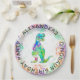 This fun colourful jurassic era T Rex dino painting includes green, blue, aqua, purple and yellow hues on a splatter paint background with jungle foliage. Add your kids name using the template to create a personalised scary T Rex prehistoric colourful dinosaur birthday party plate. Prehistoric, jurassic era, Tyrannosaurus rex original artwork by artist Catherine Sweetman.