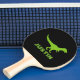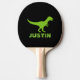 T rex dinosaur ping pong paddles with kids name. Custom T Rex dinosaur equipment for table tennis. Cute Birthday or Christmas gift idea for boys and girls. Green prehistoric Tyrannosaurus rex animal design with customisable colour background. Personalised wild trex party supplies for children. Fun toys and games for kindergarten, grammar school, elementary school child.