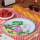 Cute hand drawn cartoon pink dinosaur birthday plates for a little girl's dinosaur themed birthday party.