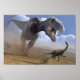 Computer artwork of a Tyrannosaurus rex dinosaur hunting an Ornithomimus dinosaur. T. rex was among the largest carnivorous dinosaurs. It was about 6 metres tall and weighed about 7 tonnes. T. rex lived in North America and Asia during the late Cretaceous period, between 85 and 65 million years ago. The head is heavily built and has the sharp teeth of a predator. T. rex is thought to have scavenged as well as hunted for food. The Ornithomimus dinosaur was about 6 metres long and 2 metres tall. I