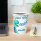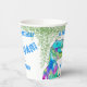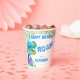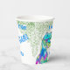 Colourful Dinosaur birthday party custom paper cups for any age. Fun T-Rex dino with watercolor Jurassic jungle foliage, with a personalised Happy Birthday Roar. The words ‘ A Happy Birthday Roar for’ with a custom child’s name. Modern fun blue typography that’s easy to personalise using the template. Original artwork by artist Catherine Sweetman