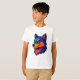 The fur is rendered with dynamic, angular strokes in a vivid gradient of blue, purple, orange, red, and yellow, creating a sense of depth, energy, and motion. The inner ears are highlighted with warm tones, while cooler shades dominate the top and back of the head, offering strong colour contrast and visual appeal.