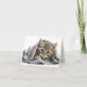 Watercolor artwork of a cute grey tabby kitten under a blanket for a blank note card.