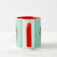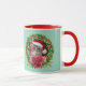A cute funny Christmas coffee mug featuring a grey tabby wearing a Santa hat looking out from a Christmas wreath.