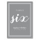 This design was created for smaller intimate wedding celebrations. Simple, minimalist and elegant Wedding Table Number SIX design features a contemporary design with a double frame border in crisp white on a trendy ultimate grey background. The design is chic and timeless. Personalise wedding table design with your wedding details in crisp white lettering and script. The back of the card is a duplicate of the front. Order one for every table with the individual table numbers.