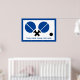 Table tennis ping-pong rackets and ball black and blue poster showcasing a minimalist pictogram icon of blue and black table tennis rackets and ball and your text on white background with blue border.