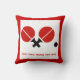 Table tennis ping-pong rackets and ball black, red custom throw pillow. It displays a minimalist pictogram icon of red black table tennis rackets and ball and your text on white background with red border.