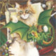 An orange maine coon cat and a small green dragon rolling mourned on a table together. Around them is dice, chess, runes sword and other gaming supplies.