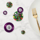 In the 19th century a poolroom was a horse race betting parlour. Pool tables were installed so the bettors could pass time between horse races. Billards, or pool, is the descendant of a game similar to croquet that was played in 15th-century Europe. Though we don't know for sure, it is strongly suspected that billiards came to America with Dutch and English settlers. By the 1700's, skilled cabinet makers were crafting beautiful tables, though the equipment was, otherwise, quite primitive. Fifteen-ball pool came on the scene in the late 1800's and grew in popularity through the 1940's. Billiards was revived in 1961 with the release of the movie THE HUSTLER. It enjoyed another surge in the mid 1980's with the release of the movie sequel, COLOR OF MONEY. Since that time, there has been an evolution of the environs in which we find pool tables -- they're in restaurants and night clubs and sports bars, allowing pool to find a modern audience and new generations of enthusiasts. This marvellous design is layers of billiard balls in varying sizes for greater depth. They are scattered all over a "green felt" backdrop on one side of the small, medium and large table confetti. On the other side, the bold, purple FOUR ball . . . making this tablefetti an excellent choice for 4th birthdays, anniversaries . . . or any other noteable fourth.
