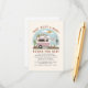 Taco themed girl baby shower books for baby with illustration of pink and white retro vintage camper trailer taco truck with baby clothes hanging on clothesline connected to birch tree under a blue sky with sun and clouds. text says "Taco Bout A Baby!" Camper is decorated with balloon garland, pampas, cactus, papel picado, and plants in terra cotta pots.