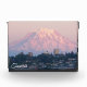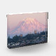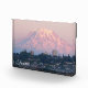 Acrylic photo block for display that features a scenic photo image of a glowing, pink alpenglow on Mount Rainier overlooking the city of Tacoma, Washington. Makes a great travel souvenir and gift!
