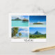Postcard showing multiple beach landscapes in the Tahiti archipelago French Polynesia consisting of tropical islands in the Pacific like Bora Bora, Moorea, Rangiroa etc with a white border and the text: 'Tahiti'.