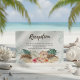 Island inspired wedding reception card features an arrangement of tropical hibiscus, flamingo and jasmine flowers and palm leaves with an aqua blue watercolor wash background. The reverse side is an abstract fan palm leaf in shades of khaki beige and taupe. Perfect for beach, destination and tropical themes.