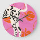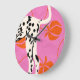 A bold and modern art print featuring a Dalmatian's hind legs and tail against a vibrant pink background. Stylised orange peaches and curved lines add a playful, abstract touch. Perfect for dog lovers and those who appreciate unique, graphic designs.