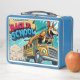 This cheerful lunchbox showcases a playful cartoon dog with a wagging tail excitedly heading to school. The design captures the joy and anticipation of a new school year.  "BACK TO SCHOOL" is written in a fun bold font. Perfect for energetic dog lovers.