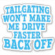 Blue filled lettering, TAILGATILNG WON'T MAKE ME DRIVE FASTER BACK OFF. Annoyed when you're doing the speed limit and another driver rides your bumper as though it will make you go faster? This sticker is for you!