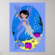 Takara is an enchanting and magical water creature known as a merfaery (merfairy). Her black hair is decorated with a beautiful blue bow. She has a flowing top and magical wings of blue seaweed, lovely blue tail and fins, and a blue pearl belt. Takara the merfaery is petting her dolphin friend and holding a seashell as they play near the sandy golden ocean floor that is decorated with green seaweed plants, red corals, purple sea urchins that blow bubbles, and lovely seashells of white and brown stripes.