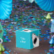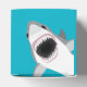 A great white shark leaps from the waves showing its teeth.  Custom text on front and back.  Great for kids' birthdays.
