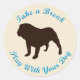 The Text "Take A Break, Play With Your Dog" surrounds a Bulldog image. Stopping to enjoy our dogs can make us more relaxed and healthier. Take time every day to play with your dog.