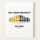 Showcase your reflective side as a chess player with a dose of wry chess humour with this planner featuring a reflective chess set along with the following chess saying: "Take A Break From Reality Play Chess". Avid chess players and chess teachers -- particularly those who understand the recreational benefit that playing chess can provide -- will enjoy this sound chess advice planner!