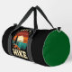 This black and green duffle bag features a classic outdoor design, with a lone hiker silhouetted against a vibrant sunset over mountains and a lake, accompanied by pine trees and the bold phrase "TAKE A HIKE." It's an ideal bag for outdoor enthusiasts, adventurers, or anyone who loves spending time in nature. Edit colour of the bag caps and body in the Design tool to your favored colours.