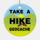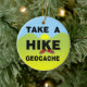 Take a hike, geocache text, with the K in hike wearing sneakers all against a yellow, green and blue landscape is a unique geocaching design for cachers at birthdays, holidays and geocaching events.