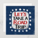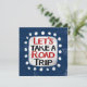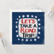 "Let's Take A Road Trip" is a cute text design in blue with black and red text. The words sit on a white accent shape surrounded by cute white whimsical dots.