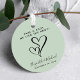 A fun sage green gift tag for shot glass, liquor or espresso wedding favours featuring "Take a Shot, We Tied the Knot" in simple typography (you can personalise to different text), two hearts together in the middle and your first names and wedding date.