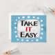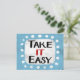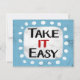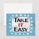 "Take It Easy" is a cute inspirational or motivational quote with a white accent shape surrounded by white textured whimsical dots.