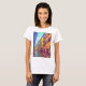 The image showcases a white t-shirt featuring a vibrant and colourful print of a charming street scene. The artwork captures a picturesque alleyway, possibly in a European city, lined with buildings in warm tones of yellow, orange, and red. The cobblestone street reflects a blend of lively hues, adding to the scene's dynamic and inviting atmosphere. The sky above is a mix of soft blues and greens, enhancing the overall artistic appeal.