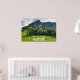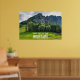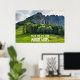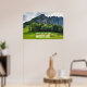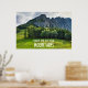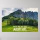 This poster features a picture of a mountain in northern Italy with a pine forest on a cloudy summer day.