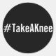 Show your support for athletes, performers, and others who peacefully protest racial inequality and police brutality by taking a knee during the national anthem by displaying and sharing #TakeAKnee stickers with bold white text on a black background.